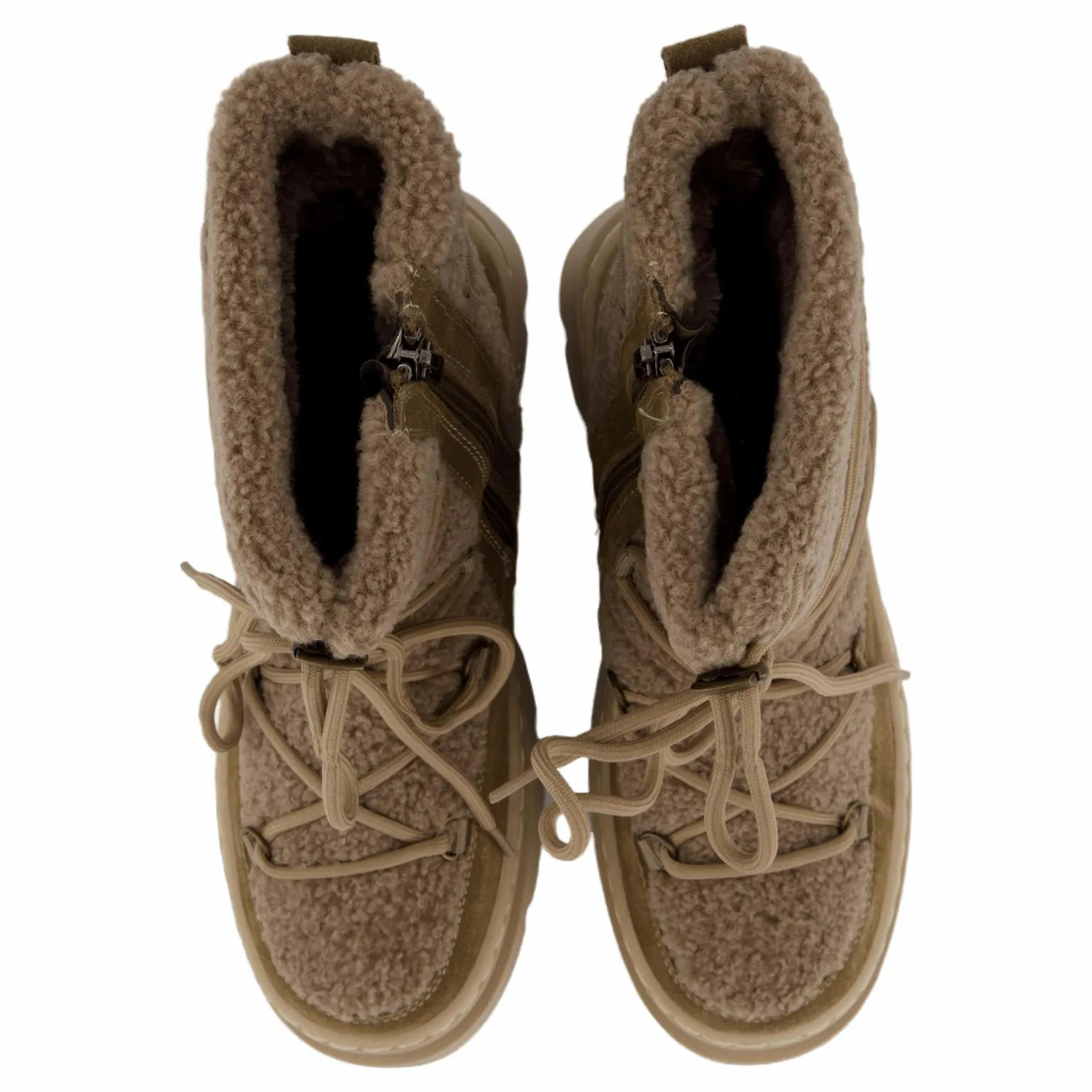 Trendiga vinterstövlar med tjock sula. Ovandeln är i teddyfleece med dekorativ snörning. Dragkedja på insidan för enkel på- och avtagning. Stövlarna är både varmfodrade och vattentäta. Klackhöjden på dessa stövlar är 4 cm och skafthöjden är 16 cm.