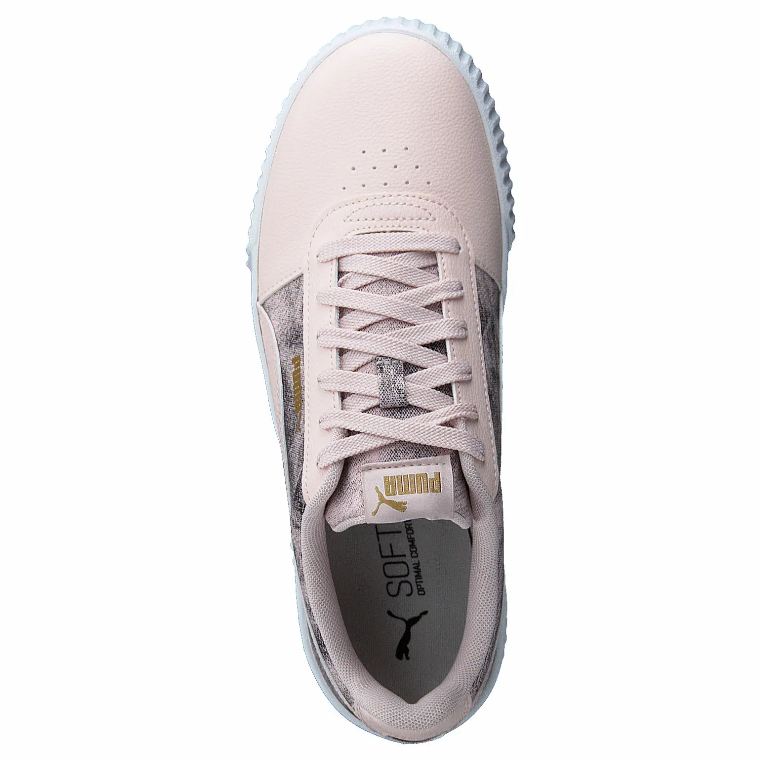 Den höga profilen på Puma Carina Tie-Dye damsneaker är perfekt för att sakkunnigt balansera retroutstrålningen i denna stil.