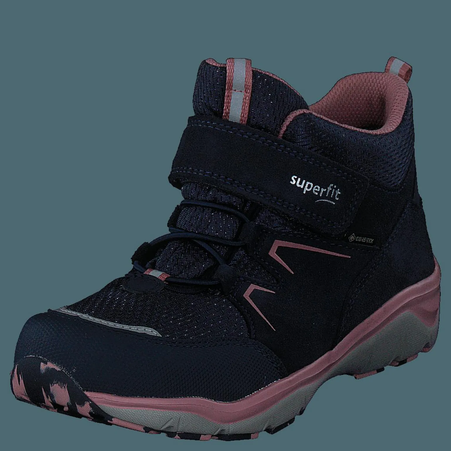 Detta är ett par svarta och blåa sportstövlar. Det är ett mjukt material, med kardborreband för att göra det lätt att ta på och av. Detta är en sko för barn.