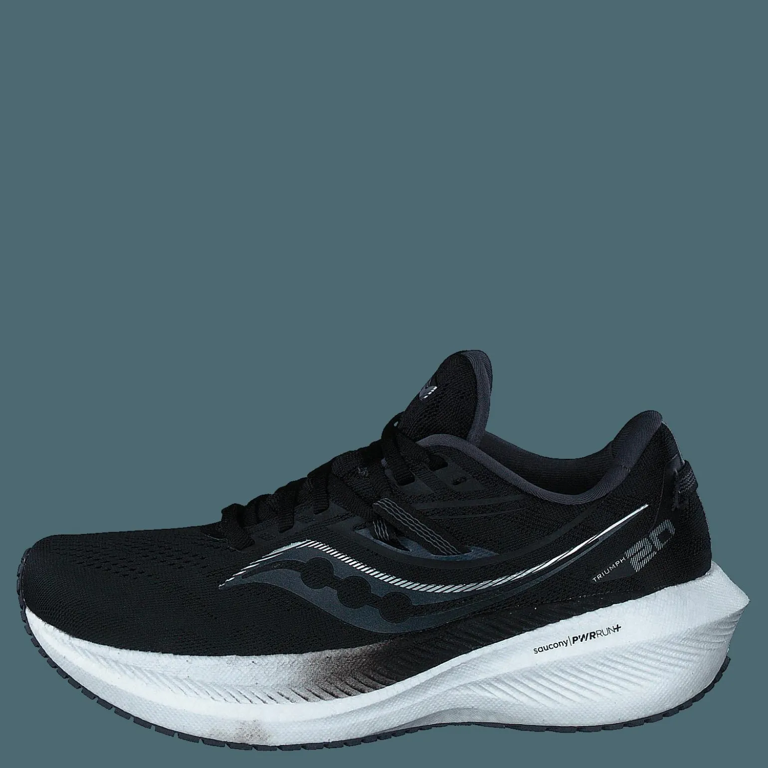 Triumph 20. När bara det bästa är bra nog! Triumph 20 är det självklara valet för dig som vill ha det bästa av allt: premium komfort, bästa stötdämpning och energiåtergivning. Hela mellan- och toppsulan består av Sauconys bästa PWRRUN+, vilket är lättare, mer stötabsorberande och energiåtergivande än tidigare stötdämpande material. Jämfört med EVA-baserade material så är livslängden dessutom tre gånger så lång, samt att påverkan av yttertemperatur är minimal. Kombinationen av 10 mm dropp, den spänstiga stötdämpning och den tydligt rundade häl- och framdelen på mellansulan ger en mjuk och avlastande känsla, med minskad rotationskraft från isättning till maxbelastning. Den unika FORMFIT-passformen skapar en optimal och individuellt omslutande passform runtom hela foten. Detta minimerar pronationspåverkan för fotleden, vilket skapar skonsammare förutsättningar för löparen. Toppen av mellansulan är anatomiskt fotformad för att vagga in foten och ge bättre stöd kring häl och hålfot. Ovanifrån kramas foten om på ett bekvämt och stabilt sätt med hjälp av en formbar, sömlös och väl ventilerande mesh, som kombineras med ett integrerat snörningssystem. Ovandelen består dessutom av återvunnet material, för att reducera vårt ekologiska fotavtryck. Yttersulan i slitstarkt XT900-gummi är optimerad för låg vikt och bra grepp.