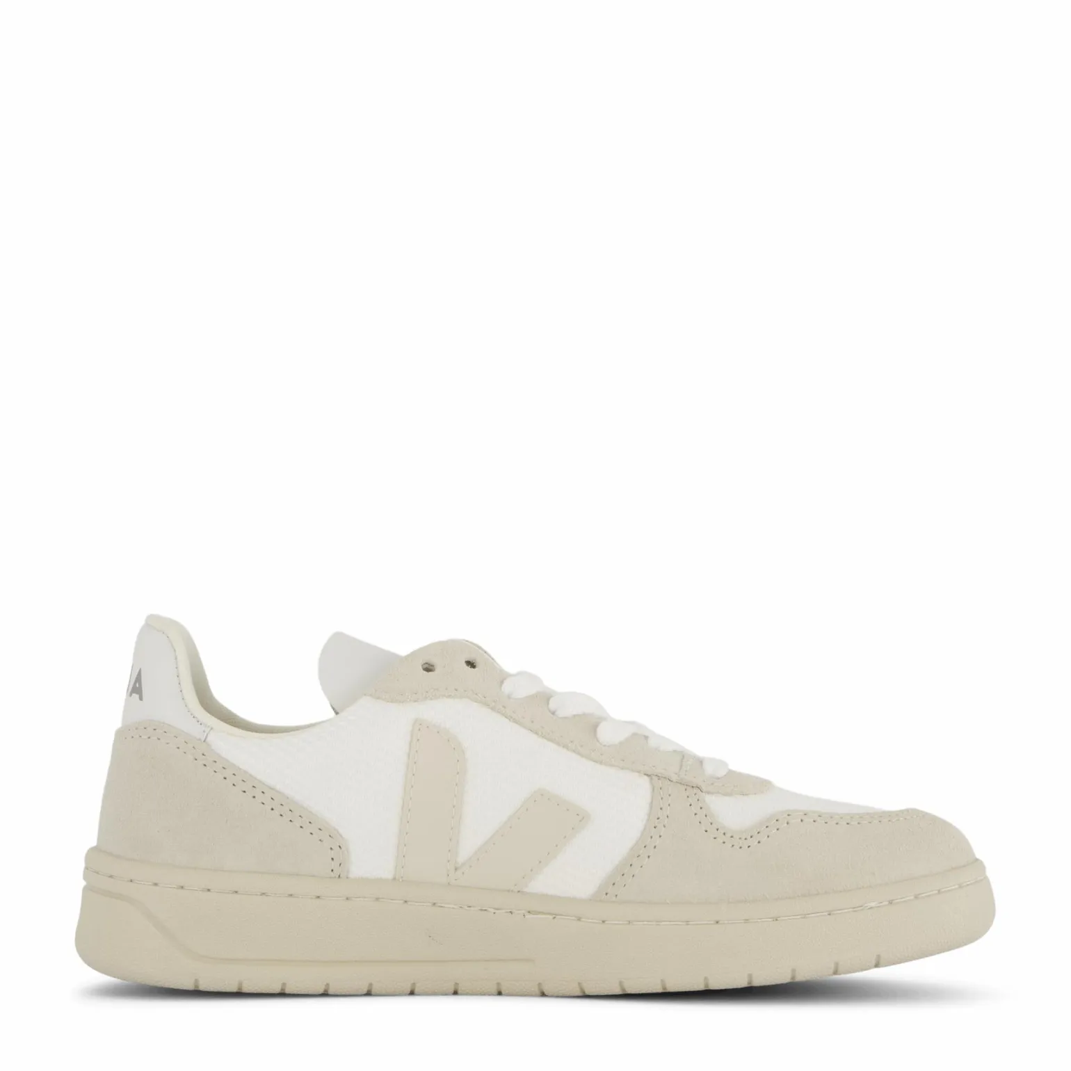 B-Mesh är tillverkad av 100 % återvunnen polyester, som kommer från återvunna plastflaskor som strimlas till flingor och sedan omvandlas till fibrer i en brasiliansk fabrik. Tre plastflaskor behövs för att göra ett par VEJA. B-Mesh är ett lätt, andningsbart och vattenavvisande tyg.